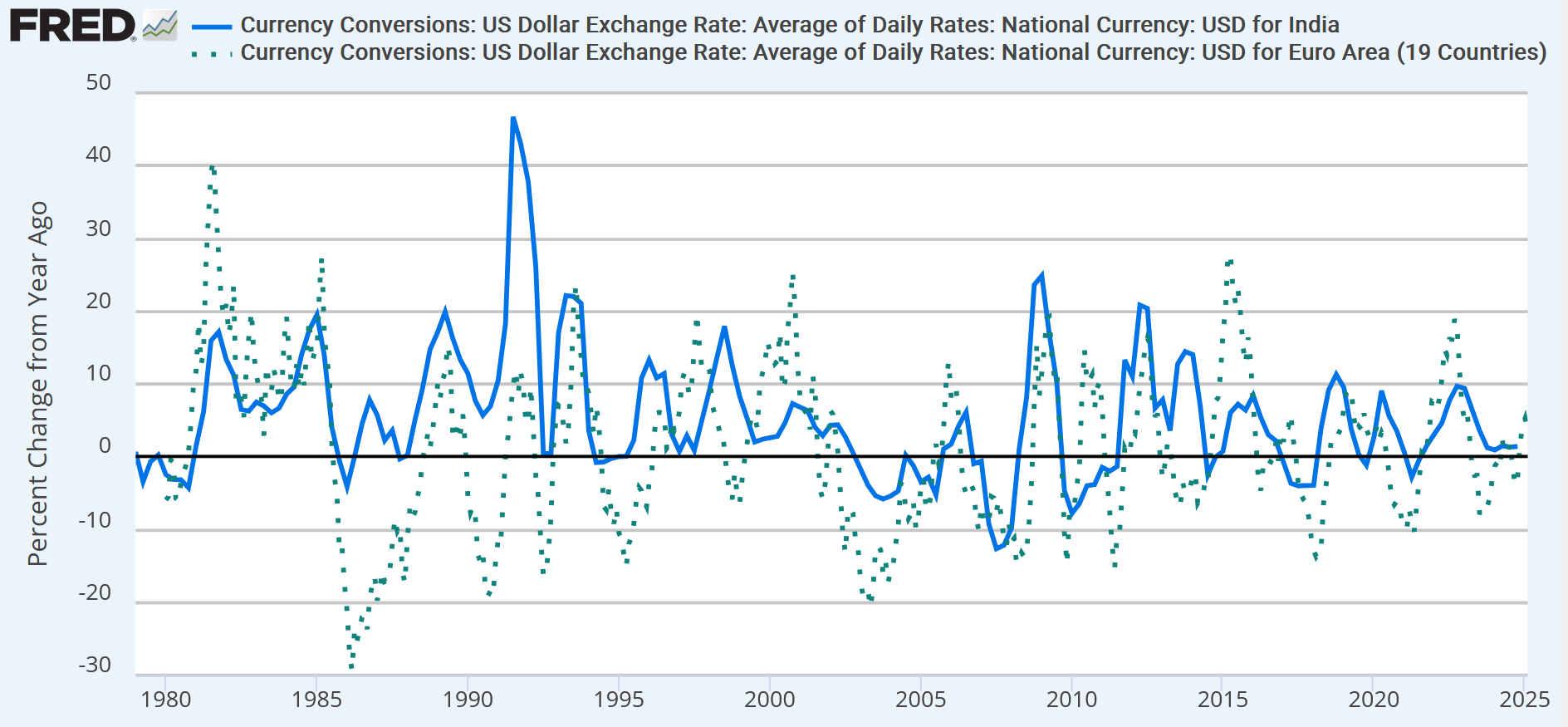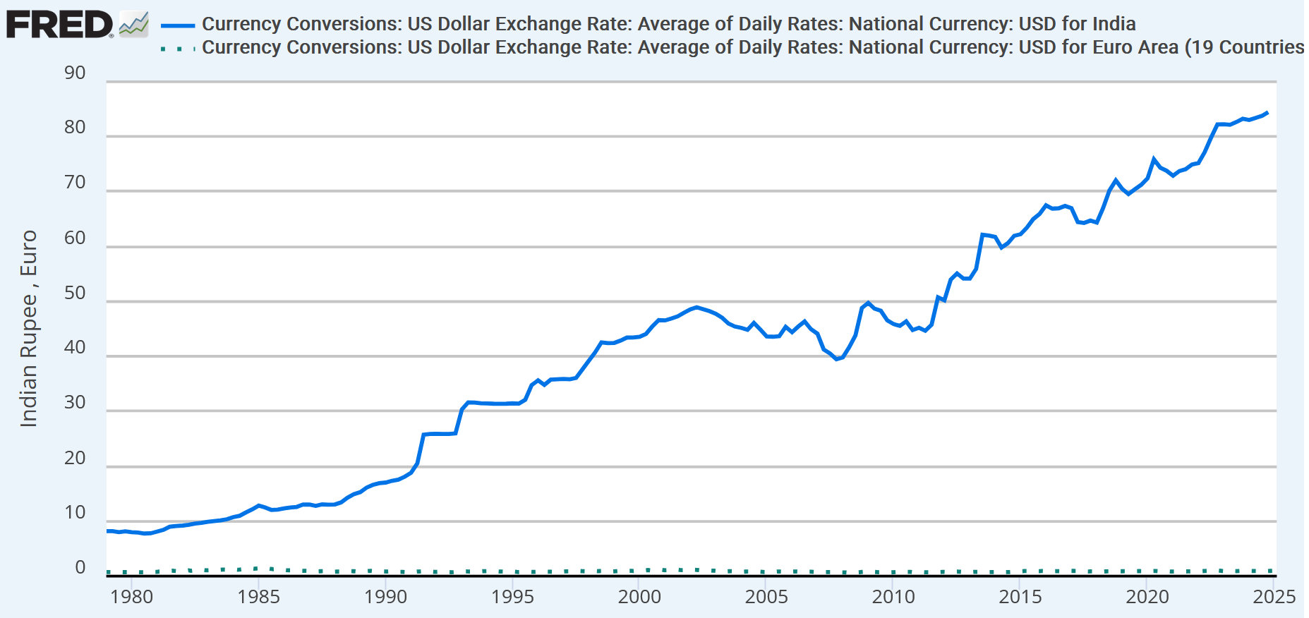 We can see this by comparing the \(E_{USD/EUR}\) (Euro) and \(E_{USD/INR}\) Indian Rupee exchange rates. In levels, the \(E_{USD/INR}\) exchange rate is inflated compared to the \(E_{USD/EUR}\) exchange rate, so the two series are not comparable. When we apply the growth rate transformation, we can compare the two exchange rates directly.